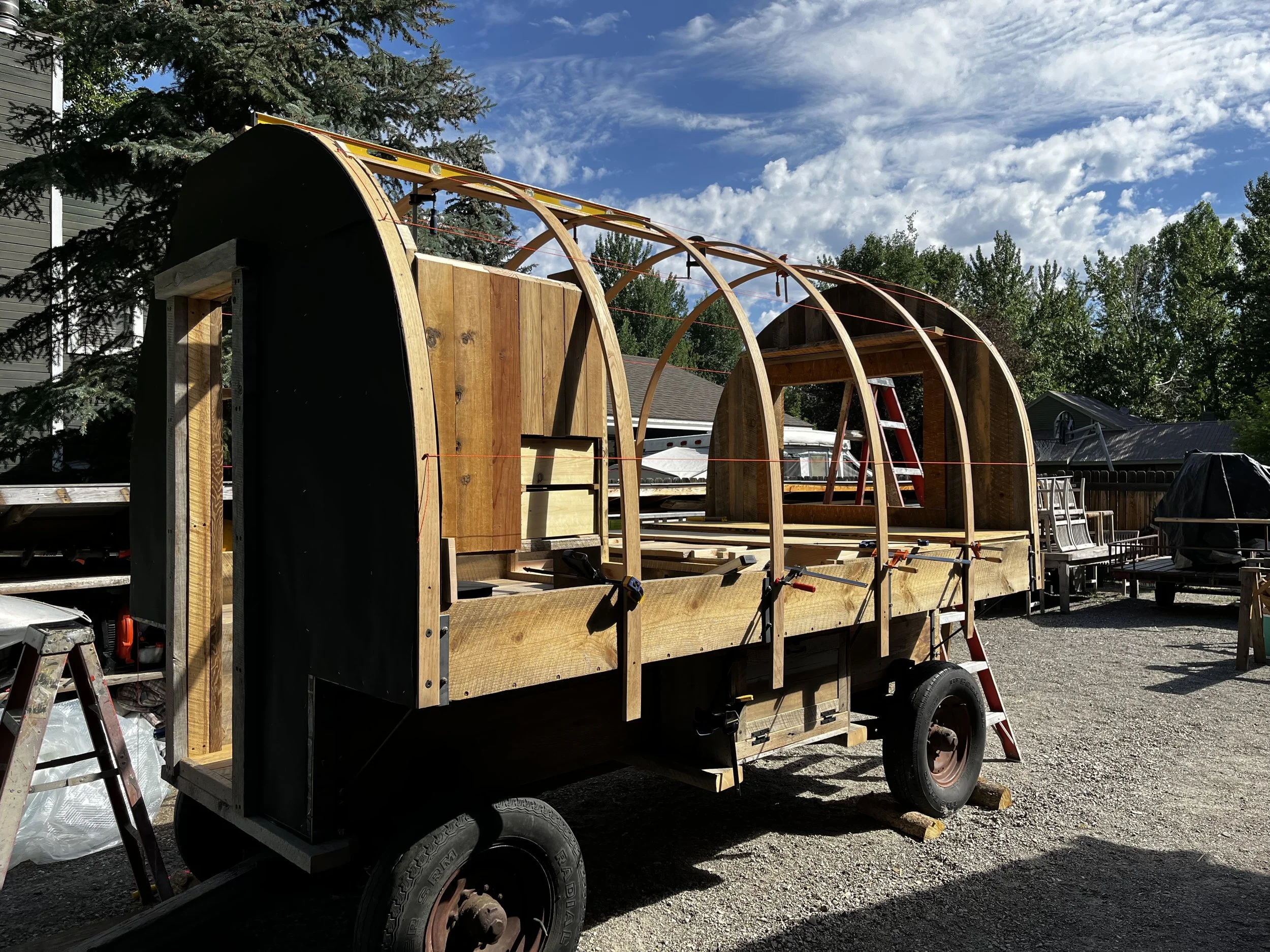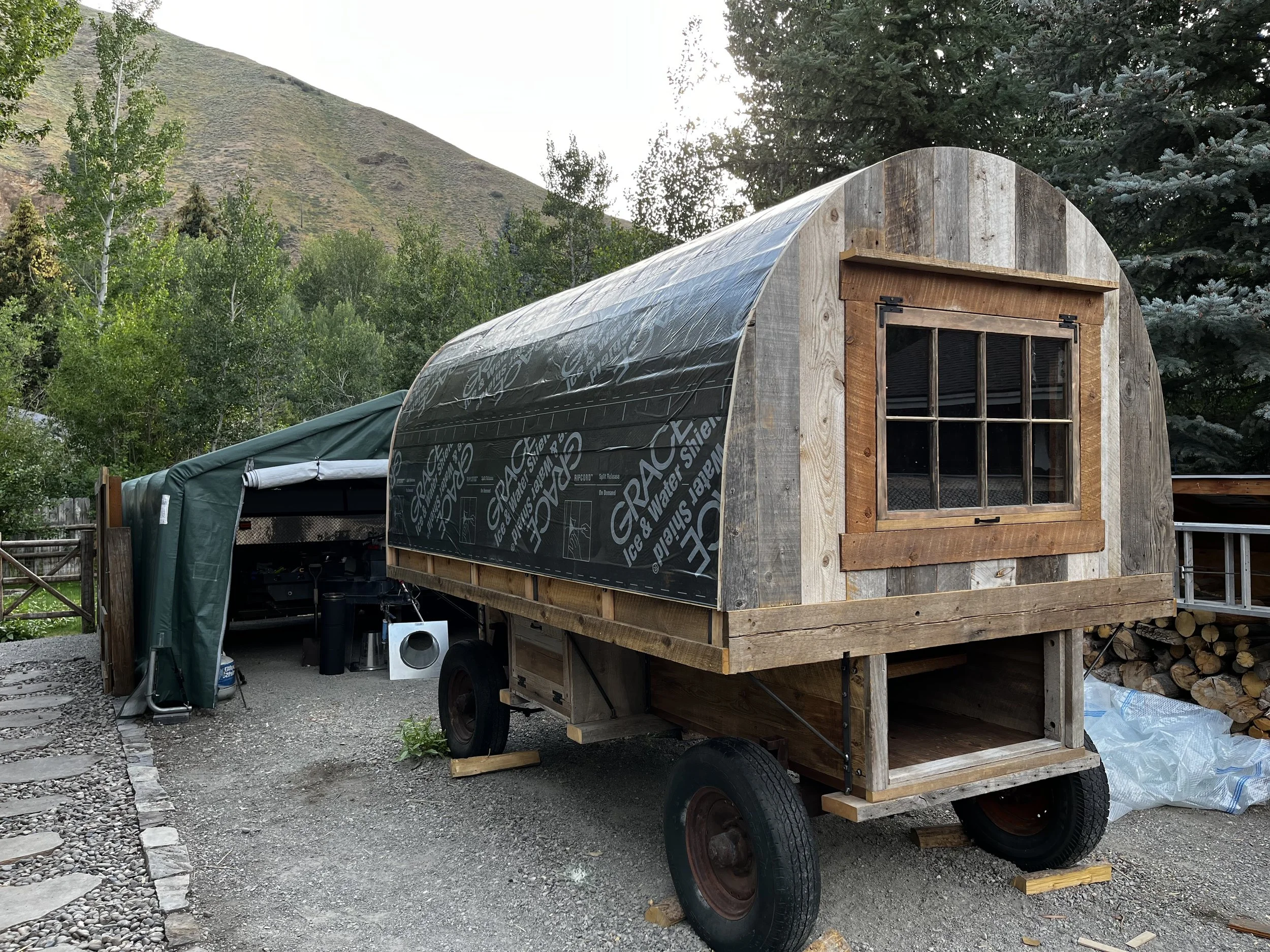 The finished wagon intended to look like an antique and blend seamlessly into the native landscape. Whether nestled on the bank of the river, alone in a field, perched on a hillside, or in your backyard it will serve as a unique guest room or quiet space to read and relax.