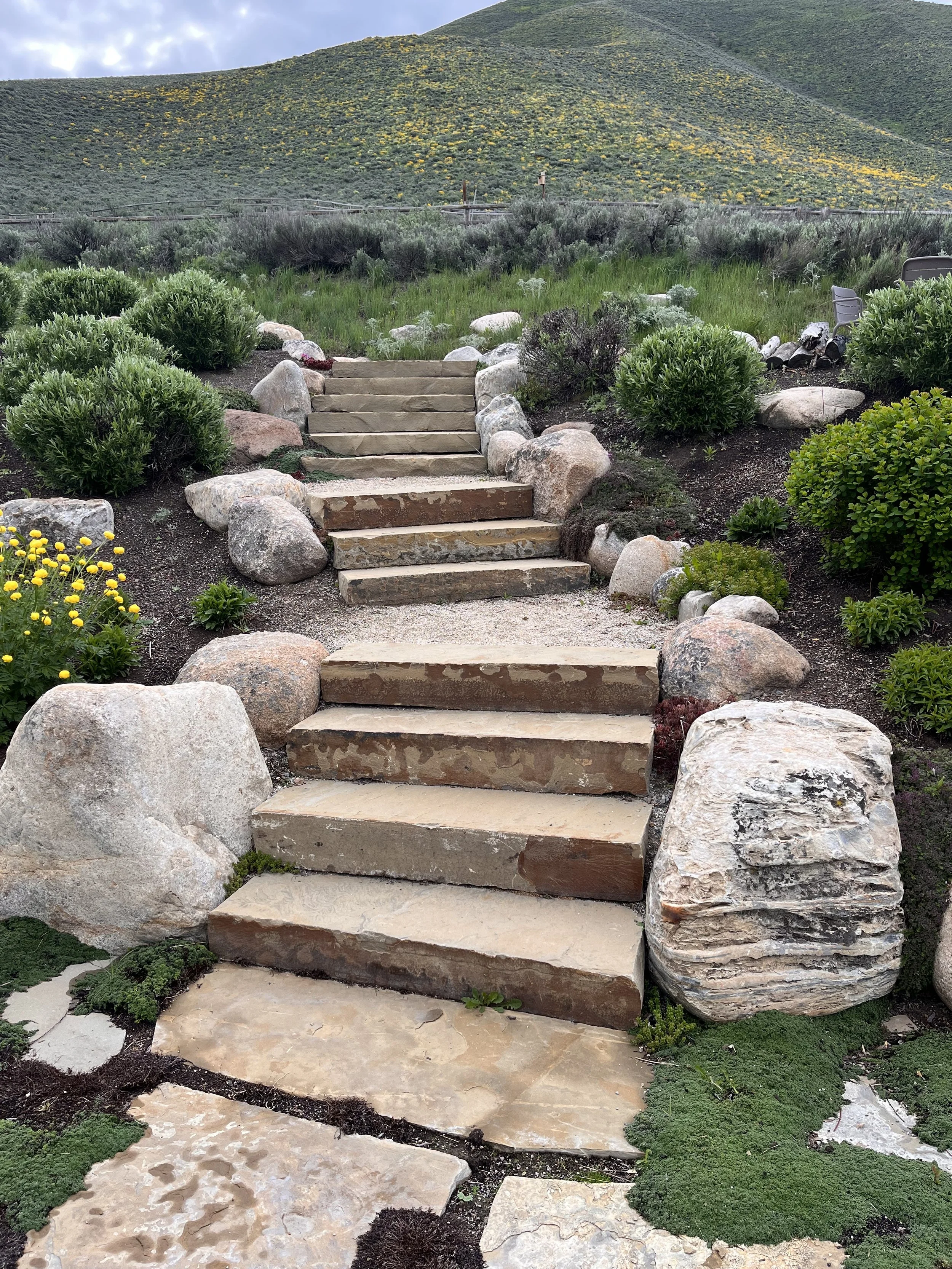 Natural stone flagstone patios, stair treads, boulders, and retaining walls bring the look and feel of the native landscape into your backyard